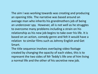 The document summarizes an evaluation of a student film project to create an opening title sequence for a comedy spy film. The sequence involved overlaying footage of the main character's normal and secretive lives. Feedback was collected from the target audience of younger families and students. While the typography and transitions worked well, the overall sequence was confusing due to trying to include too many scenes and overlays. The student learned about using technologies like green screen and editing software, but also about simplifying ideas and improving planning and communication within the film group.