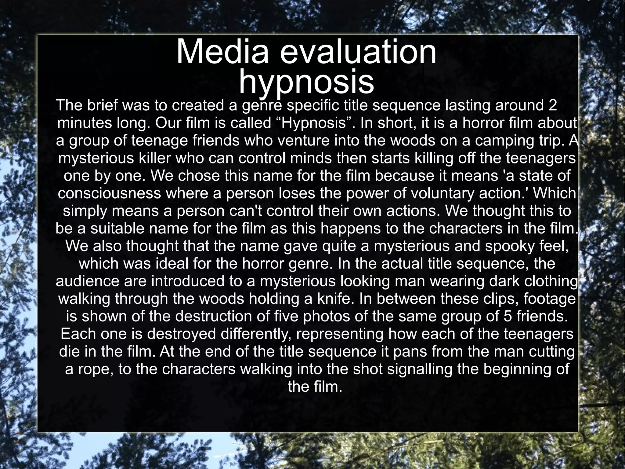 The document summarizes a student media project creating a title sequence for a horror film called "Hypnosis". The students researched existing title sequences to understand effective techniques. Their sequence introduces a mysterious man walking in the woods holding a knife. Footage shows photos of friends being destroyed, representing how each character dies. The students aimed to convey mystery and intrigue rather than directly showing the narrative. They used short clips, blood/fire imagery, and unsettling typography and editing to set an ominous tone for the genre.
