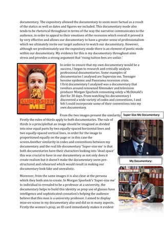 The author analyzed documentaries like Super Size Me to incorporate conventions like interviews, establishing shots, and found footage. They also researched magazine spreads to include elements like mastheads, captions, images, and headlines. For the radio trailer, the author studied professional examples and chose a calm voiceover to attract listeners.