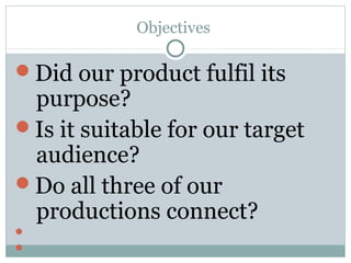 1) The music video fulfilled its purpose of appealing to its target audience of 14-22 year olds through its bright colors, hip-hop genre, and inclusion of club scenes.