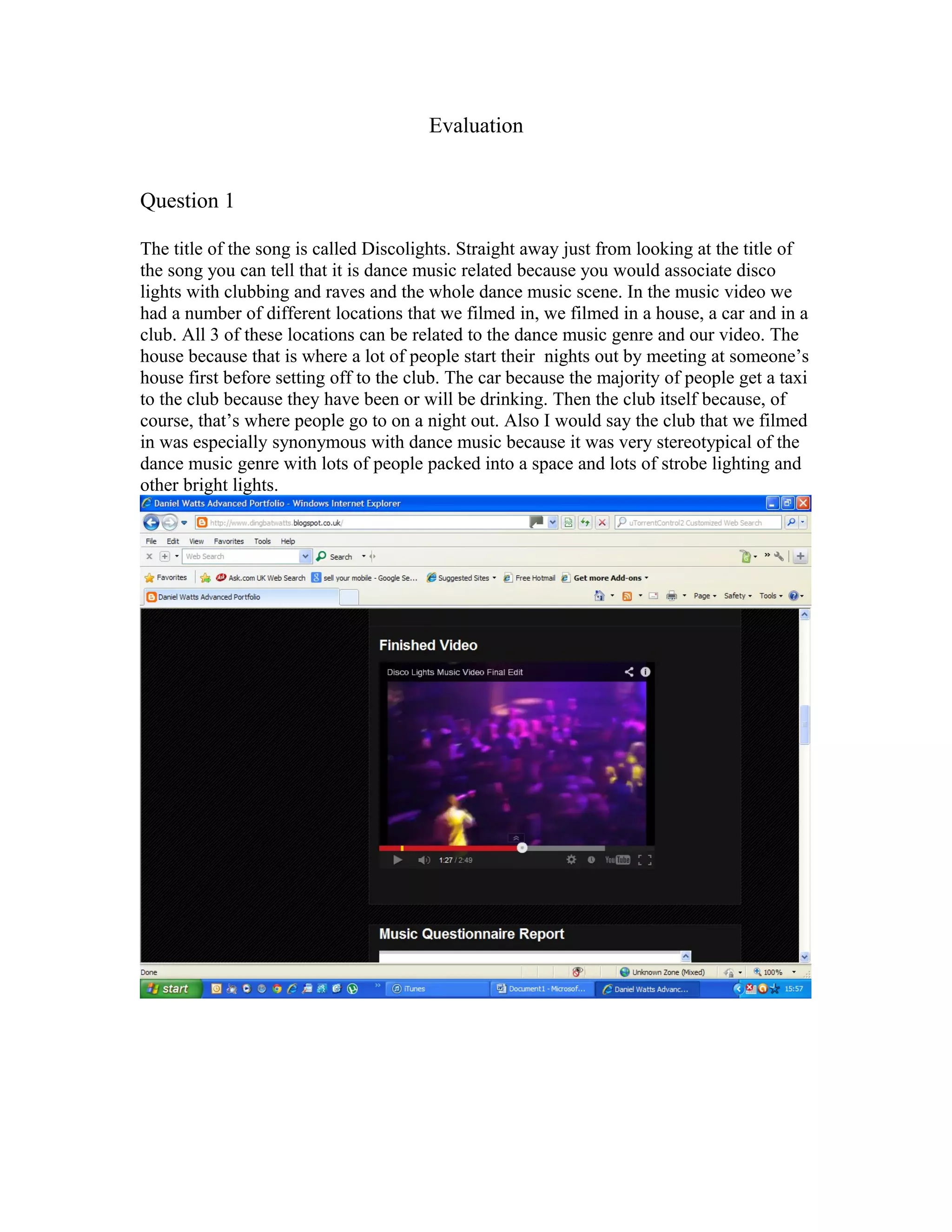The document discusses the evaluation of a music video created for the song "Discolights".