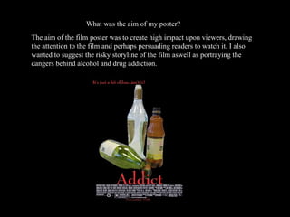The poster aimed to draw attention to the film's risky storyline about alcohol and drug addiction using striking colors and imagery. The magazine cover aimed to advertise the film and grab attention using conventions like the magazine name in bold font and a brooding actor photo.