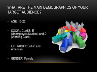 The target audience for the media products was 16-26 year old British and American females from working class backgrounds. To attract this demographic, the music video drew inspiration from empowering videos like Beyoncé's "Single Ladies" and included a female-dominated dance routine. Scenes were filmed in busy city centers and parks to appeal to younger audiences. Feedback identified strong casting choices that matched the target age and relatable relationship and dance scenes. However, conventions of wealth and uncovered flesh were deemed weaker aspects that did not align with the realistic themes aimed at the 16-25 age range. Taking audience feedback is important to create engaging products that people want to watch and will generate sales and promotion opportunities.
