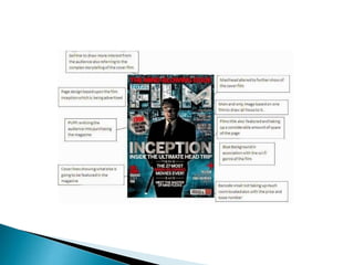 The document discusses the conventions and techniques used in creating a movie poster, film trailer, and movie magazine to promote the fictional film "Asylum". Key conventions included using a short memorable title in red font on a black background for the poster, including a tagline and imagery of a character for mystery. Feedback was gathered to refine the trailer's narrative. Research of real media products informed the design of all promotional materials to follow industry standards.
