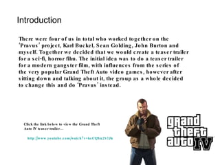 1) The document discusses the creation of a teaser trailer for a sci-fi/horror film called "Pravus" by a group of four students.