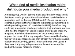 The document discusses how the media product presents social groups. It notes that the magazine targets teenage males as they make up the majority of fans of underground music genres like hip hop. While hip hop appeals more to males, the photos have a moody style associated with underground music. The articles challenge stereotypes by positively portraying artists gaining mainstream popularity from underground scenes. This helps emerging artists get recognition and underground music reach larger audiences.