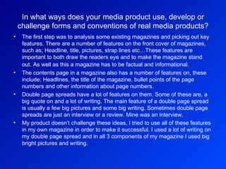 The document analyzes a media product created by the author, a magazine aimed at 15-20 year olds interested in indie, pop punk, and rock music. The author evaluates their use of magazine conventions like headlines, pictures, and double-page spreads. They also discuss representing their target audience, potential distributors like Bauer Media, and lessons learned about design techniques.