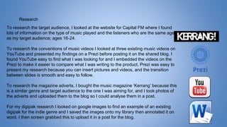- Research was conducted online using Google Chrome, Safari, YouTube, and music magazine websites to learn about conventions and target audiences. Research was posted to a shared blog.
