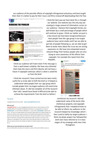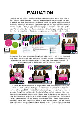 The document provides an evaluation of media products created for a campaign about copyright awareness. It summarizes that the evaluator's website, posters, and Twitter account were clearly linked through shared logos, slogans, colors, and target audience. Feedback was gathered through surveys and presentations which helped improve the work. The target audience was refined to specifically focus on females ages 15-17. The products were created to raise awareness of copyright issues among this group and provide education on related topics.