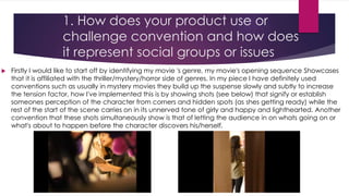 The document provides an evaluation of a media studies project by Hiba Kausar. It summarizes how her opening movie sequence uses conventions such as building suspense through subtle shots to engage audiences. It discusses her target teenage female audience and how the movie could be distributed through Paramount Pictures or online platforms. The project helped develop Hiba's production skills in areas like inspiration from movies, editing techniques, and use of technologies like iPhone recordings and DSLR camera filming.