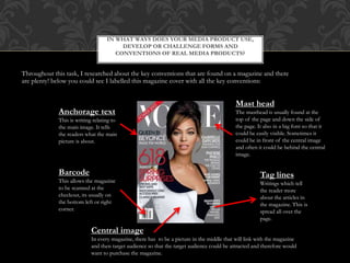This document discusses how the media product, a magazine cover, represents its target audience of primary school children. It uses key conventions like a central image of a smiling boy, a bubbly masthead in bright colors, and short, simple taglines using fonts and colors related to their contents. The magazine cover aims to attract children visually with its bright, fun design elements and language they can easily understand. Overall, the cover is designed to appeal specifically to young children through its representation of them as the target audience.
