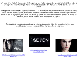 The document discusses the process of creating a thriller opening for a class project. It describes how the group researched different thriller genres and films to understand conventions and aesthetics. They examined physiological, supernatural, and neo-noir thrillers. Based on this research, the group decided on the name "Remember Me" for their thriller. They used techniques like non-linear storytelling with flashbacks. Camera angles, lighting, and editing styles were adapted from the researched films to set mood. Through the process, the student learned about filming, editing, and technologies used in media production.