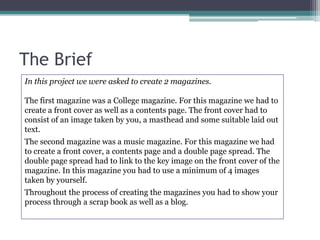 Ella Gardner created two magazines for her media studies project - a college magazine and a music magazine. She spent most of her time learning how to use QuarkXpress to design the music magazine but wishes she had taken her photos and done more research earlier. Her music magazine cover was influenced by many magazines and received positive feedback, though some said the text was hard to read against images. In the future, she plans to manage her time better and put more effort into her blog and scrapbook to better document her progress.
