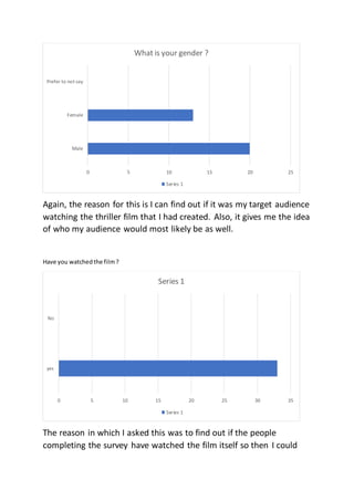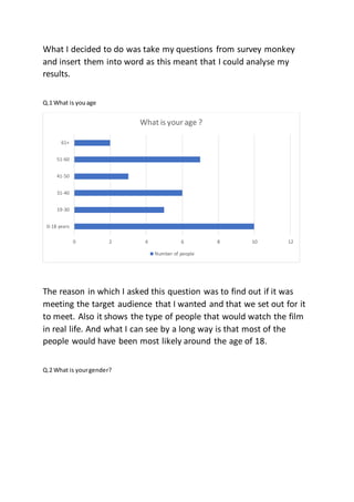 The document summarizes the questions from a survey about a film and the reasons each question was asked. It includes pie charts showing the results for questions about the age and gender of respondents, whether they enjoyed the film, and their opinions on aspects like editing, camera work, lighting, storyline, characters, and plot twist. The questions were aimed at understanding who the target audience was and determining what aspects of the film people liked and disliked in order to identify areas for potential improvement.