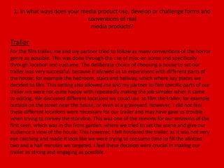 1) How they followed horror genre conventions in the trailer and challenged conventions for the magazine cover.
