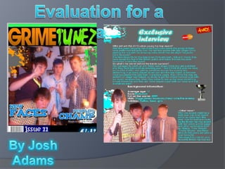 The document is an evaluation of a magazine created by the author. It summarizes the key elements included in the magazine such as the front cover, contents page, and double page spread. It discusses design choices like using pictures, fonts, and colors. It also reflects on the process of creating the magazine, including research conducted and challenges faced in competing with real magazines. The author aimed to target 16-18 year old males interested in grime music by applying lessons learned from reviewing other magazines.