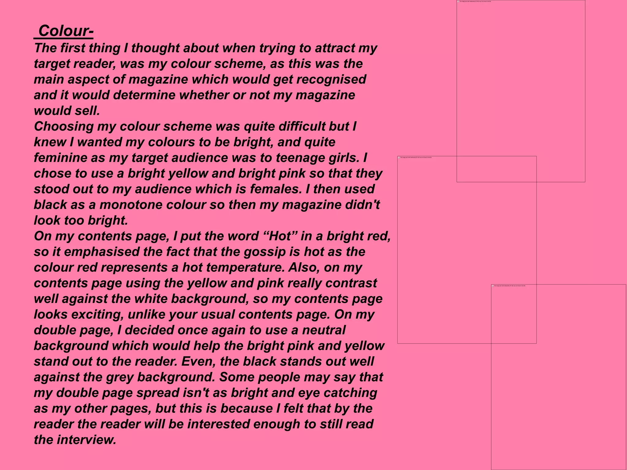 The document discusses how the author addressed their target audience of teenage girls in their magazine design. They chose a bright pink and yellow color scheme to stand out. Their model Emily is naturally pretty to be relatable. The masthead uses bold pink and questions to catch readers' attention. Bursts of bright yellow against dull backgrounds are eye-catching. Callouts with questions and tips attract readers to learn more and benefit from the magazine. Images of famous artists provide sex appeal and role models for the audience.