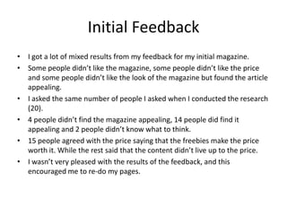 - The author conducted initial feedback on their magazine which was mixed, with some respondents not liking the magazine, price, or design. They then reworked the pages.