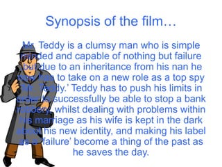 Mr. Teddy is a clumsy man who inherits a role as a top spy after his nan leaves him an inheritance. As Mr. Teddy, he must stop a bank robbery while dealing with problems in his marriage, as his wife does not know about his new identity. The filmmakers created a title sequence for their action/comedy film inspired by movies like Johnny English and Dumb and Dumber. They focused on introducing characters, setting up mysteries, and indicating the genre and time period through lighting, camera work, and costumes. Researching target audiences and existing title sequences helped make their sequence appealing.