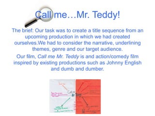 The document discusses a student film project to create a title sequence for a comedy action film called "Call Me Mr. Teddy." The sequence introduces the main character Teddy, who is clumsy but inherits a role as a spy. To attract their young audience, the students incorporated comedy through Teddy's clumsy actions and included typical elements of action and spy genres like fight scenes. Through the process, the students learned about applying genre conventions and targeting audiences in their title design.