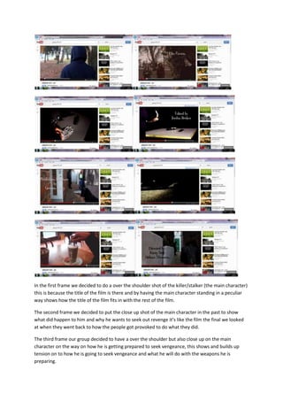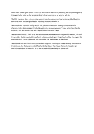 The document describes 8 frames from a film depicting the story of a stalker seeking revenge. Frames 1-4 show close-up and over-the-shoulder shots of the stalker preparing weapons to build tension. Frame 5 uses an extreme close-up of the stalker's shoes to further increase tension. Frames 6-7 build tension by showing the stalker following and concentrating on his victim from a distance. Frame 8 is a long shot showing the stalker waiting in the distance for his attack, unaware to his victim.