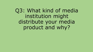 This document discusses potential media institutions to distribute a new monthly music magazine. It analyzes companies like Bauer Media Group and Time Inc. UK that currently publish similar magazines. While magazines like NME and Uncut are competitors, the document argues that a monthly format would appeal to a different audience. It suggests Wenner Media, the publisher of bi-weekly Rolling Stone, would benefit from adding a monthly music title to fill gaps. Additionally, selling the magazine in supermarkets, newsagents, and music shops would make it widely accessible to the 16-35 year old target audience. An online subscription and e-magazine would also increase accessibility.