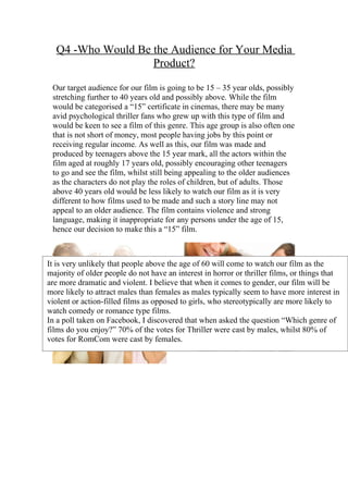 Our target audience for the film is 15-35 year olds who enjoy psychological thrillers. This age group has disposable income and many grew up watching similar films. As the film was made by teenagers aged 15 and up and stars actors aged 17, it may appeal to other teenagers while still interesting older viewers. Those over 40 may not connect with the storytelling style, and those over 60 are unlikely to be interested due to a lack of interest in horror genres. The film is targeted more towards males than females based on typical genre preferences.