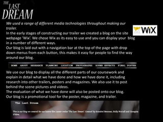 We used a range of media technologies throughout the construction and evaluation of our trailer project. This included: