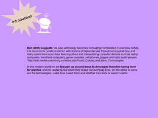 The document discusses the various media technologies used at different stages of a media production project. It describes using a computer for research, planning and accessing programs. Blogger was used to layout and share work, while YouTube allowed embedding videos. Google Images aided research. An SLR camera and lighting equipment were crucial for high quality photos and stop motion. Photoshop and Premier Pro were important editing tools. File formats needed changing for sharing. SlideShare and PowerPoint helped communicate work. A green screen could have enhanced the final production.