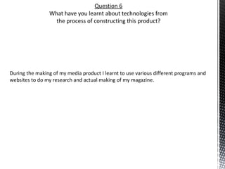 I learned to use various programs and websites to research and create my magazine. These programs included tools for research and design of the magazine. The process taught me new skills in creating media products.