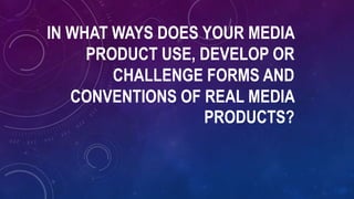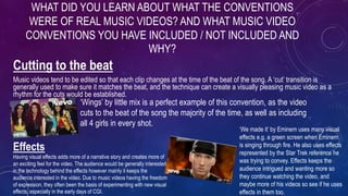 The document discusses conventions of music videos including editing clips to match the beat of the song, using visual effects, lip syncing/miming, different camera shots and movements, and various camera angles. It provides examples for each convention from specific music videos. The response discusses including conventions of lip syncing/miming, different camera shots and angles, and visual effects in their own music video while also learning about typical conventions from real music videos and genres.