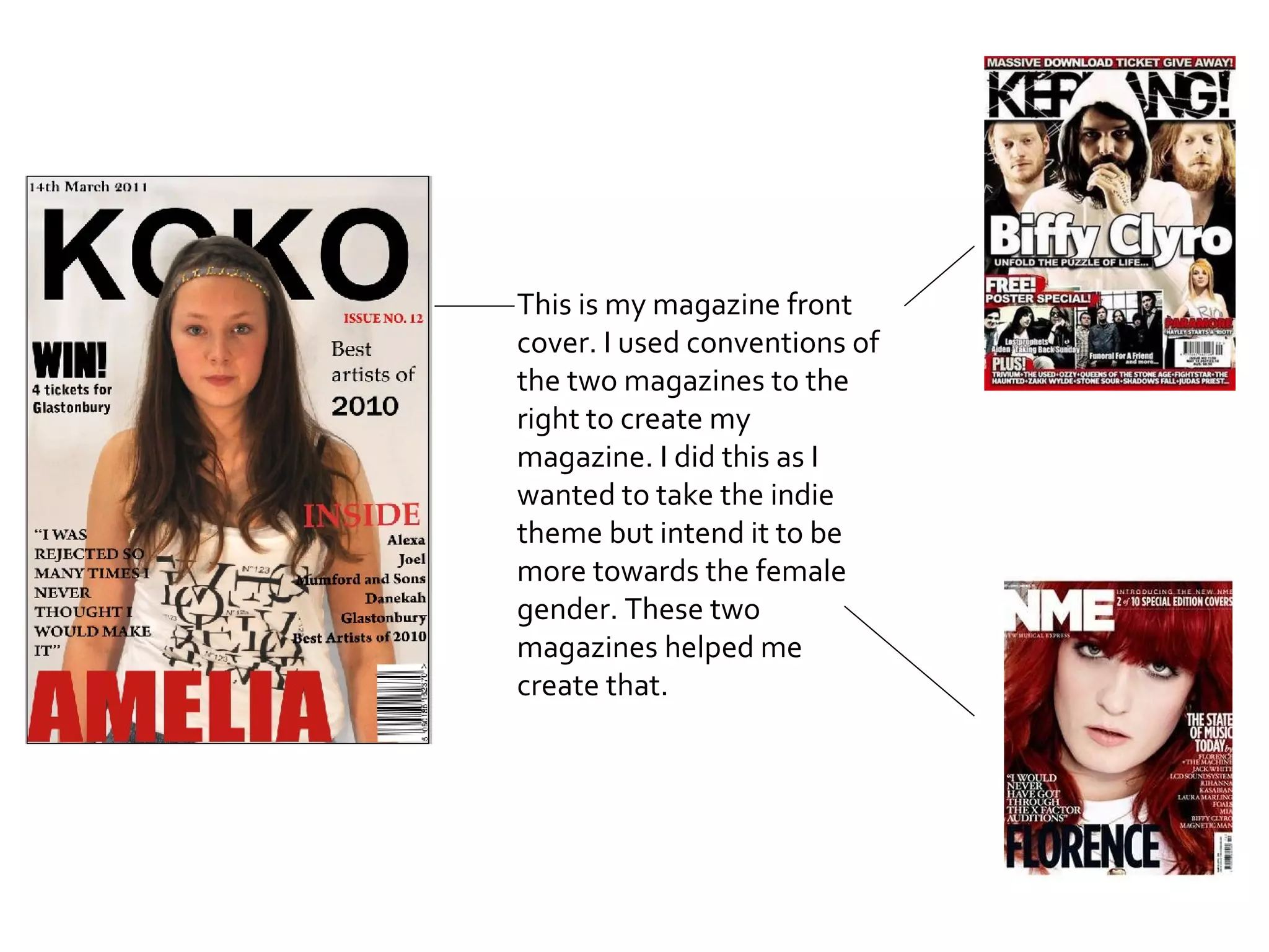 The document describes how the creator of a magazine front cover was inspired by and copied conventions from two existing music magazines, NME and Kerrang, to design their own magazine intended for a female audience. Key elements copied included layouts, fonts, colors, photo styles, and sections like contents pages. The goal was to take the indie theme but make it more appealing to women, incorporating conventions from the example magazines into the creator's own style and design.