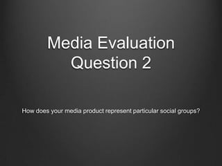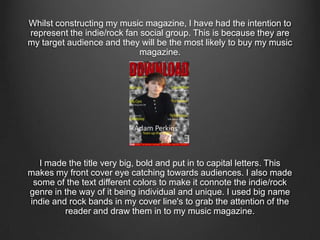 The document summarizes how the media product, a music magazine, represents the indie/rock fan social group. It conducted a questionnaire of indie/rock fans to determine colors, styles, and visuals that represent the genre. Based on the results, the magazine features a color scheme of red, white, black, and yellow and images of artists in black, holding guitars, and wearing fashionable indie styles. Photographs also include effects to appear unique and depict music imagery or direct address to engage the target audience.