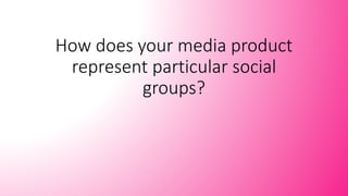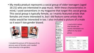 The document summarizes how a media product represents a social group of older teenagers aged 16-21 who are interested in pop music. The magazine features mainly female pop artists that this demographic is interested in, as well as some male artists, and includes articles on fashion tips and exclusive artist interviews rather than gossip. The magazine adheres to conventions of pop music magazines by focusing only on currently famous pop artists like Bruno Mars and Beyoncé.