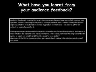 Audience feedback helped determine if the product successfully targeted its intended audience and could sell well. Speaking to a diverse group about the song and music video provided insights into what worked well and could be improved. While reception was mixed, hip hop and grime music fans seemed most engaged. Using a more focused sample of people within the target music genres could provide more accurate feedback for improving future products.