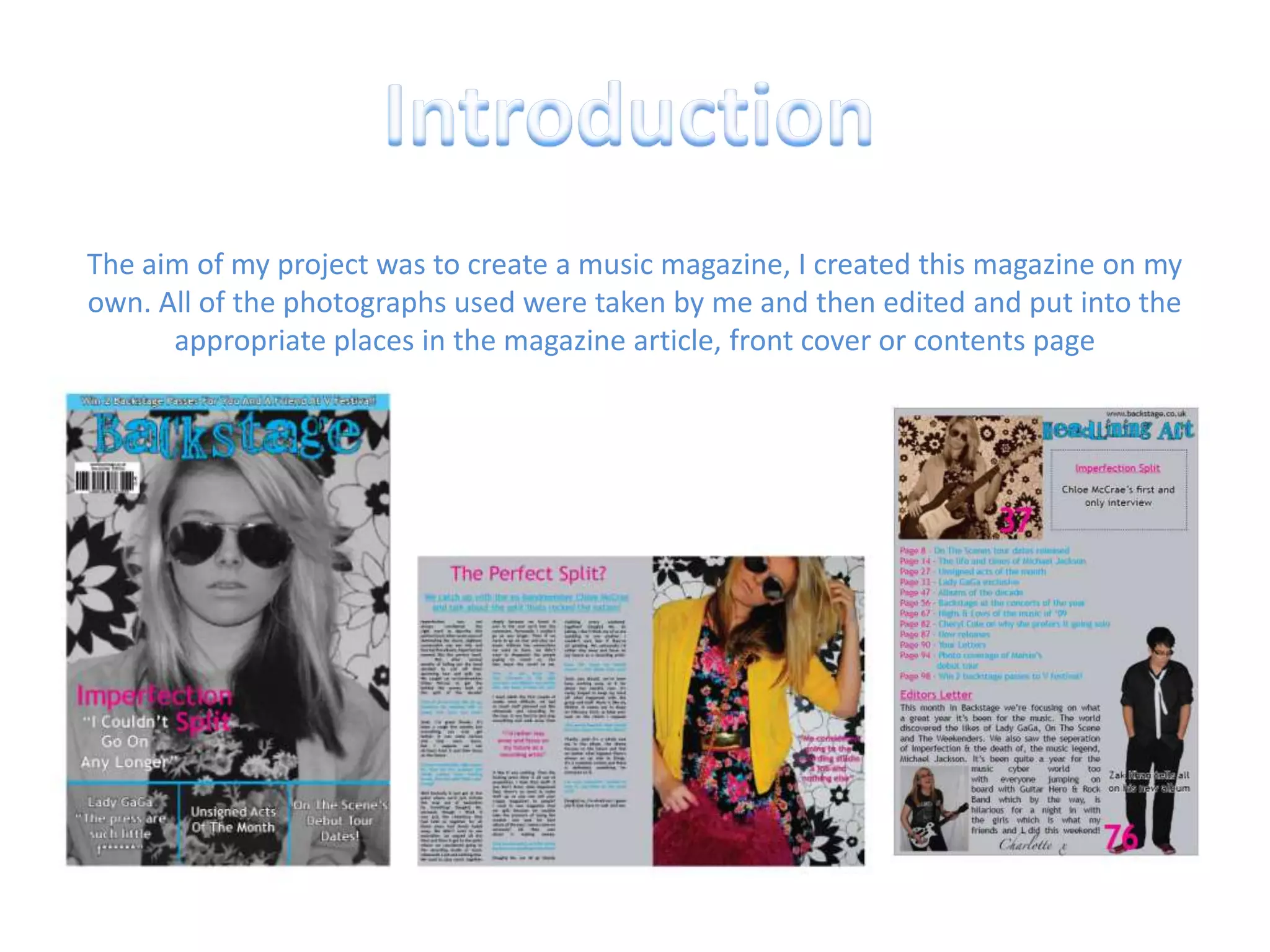 The document describes a student's music magazine project. The student created the magazine independently, taking all photographs and editing them for inclusion. The target audience was females aged 15+ and the magazine focused on chart music. Inspiration was drawn from Q Magazine for its similar genre and conventions like prominent cover photos. The contents page included competitions, photos and an editor's letter to engage readers. A feature article on a band splitting up used bright photos, subheadings and questions to grab attention. The student learned new skills in photography, editing and desktop publishing software to create the magazine.