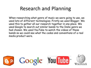 The document discusses the use of various media technologies in researching, planning, and constructing a music video project. Blogger was used to gather and organize all research in one central location. Google was used for initial research on similar bands and the music industry. YouTube provided examples of music videos in the chosen genre to understand conventions, and was also used to upload the final video and collect audience feedback. Final Cut Pro software was used to edit video clips, change their order, add effects, and construct the final music video. A tripod and HD camera were used to film footage of the actor for the video.