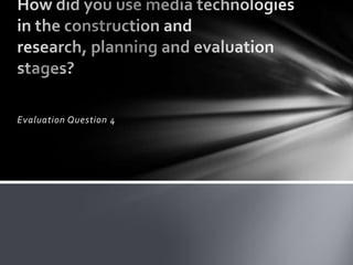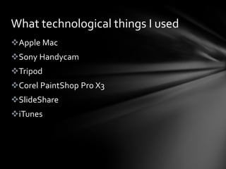 I used an Apple Mac running iMovie to edit footage from a Sony Handycam and add visual/audio effects to create a music video. A tripod was used to keep the camera steady. Corel PaintShop Pro X3 was used to alter photos and design materials. SlideShare presented PowerPoint presentations online. iTunes provided the music for the video project in iMovie.