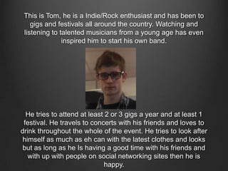 This document discusses the target audience for a media product. The audience would be Tom and Hannah, who are indie/rock music enthusiasts in their late teens/early 20s. They enjoy attending live music gigs and festivals several times a year with their friends to listen to talented musicians. Music provides them escapism and a sense of individuality and community.