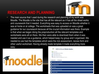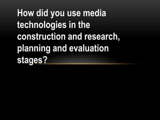 The student used various media technologies at different stages of their project. During research and planning, they relied heavily on Moodle to access course materials and templates. PowerPoint was used for initial presentations and gathering feedback. Google, YouTube, and Prezi supported research of case studies and inspiration. Communication between group members was done through Hotmail, WhatsApp, and group chats. When constructing their film, they used a Canon DSLR camera, tripod, dolly, microphone, and learned filming techniques. Final Cut Pro was used for editing, with challenges in lighting and lost audio. Photoshop supported poster creation, learning tools like cropping and layering. InDesign, Illustrator, and Blogger also contributed