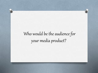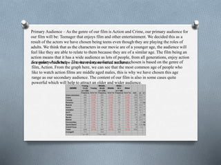 The document discusses the target audience for a media product. The primary audience is identified as teenagers who enjoy films and entertainment, as the main characters in the action/crime film are teenagers even though they play adult roles. The secondary audience is identified as middle-aged males, as research shows they are the most common viewers of action films. The target social class is identified as teenagers aged 13-35, with a 12A certificate, as the plot and young actors would appeal most to this group. Research also showed more males watch action films than females. The target audience is identified specifically as male teenagers, as statistics show males at a younger age prefer action films, and having teen characters in lead roles makes the film more relatable to