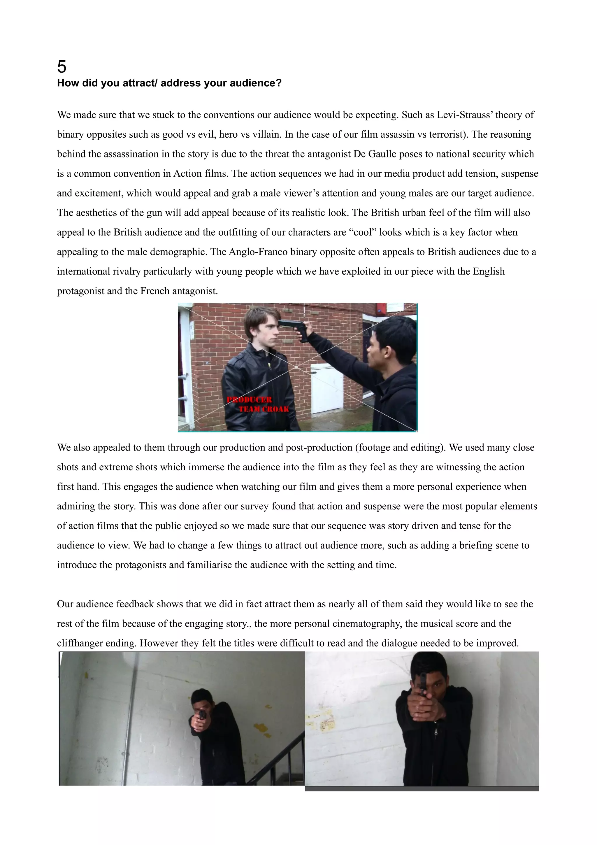 The document discusses how the filmmakers attracted their target audience of young males for an action film. They stuck to common action film conventions like good vs evil and used an Anglo-Franco rivalry as the central conflict. Action sequences, realistic gun aesthetics, and "cool" character outfits were used to appeal to the male demographic. Close-up shots and editing techniques immersed viewers to engage them. Audience feedback confirmed the film succeeded in attracting viewers through its story, cinematography, music, and cliffhanger ending.