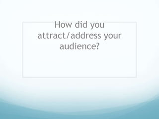The document discusses how the author addressed their target audience of 18-25 year olds for a horror movie. They created a questionnaire with questions about horror movie preferences that was taken by 20 people in the target group. The results showed that the audience preferred scary films and found serial killers, graveyards, and football most frightening or appealing. The author used these findings to make creative decisions for their horror film, including including a scary tone, a female serial killer antagonist, an opening graveyard scene, and incorporating football. The questionnaire helped the author understand the audience's views and tailor the film accordingly.