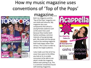 The document discusses how the student's music magazine both uses and develops conventions from the existing "Top of the Pops" magazine, while also changing some conventions. It describes using bold colors, cover lines about fashion and boys, and left-justified text like "Top of the Pops". Developments include a less busy front cover with clashing colors, and a contents page including an editor's column. Conventions that are changed include not filling the front cover with an image and including monochrome photos on the double-page spread to seem more sophisticated.