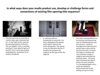 The document discusses an opening title sequence for a film project. It provides analysis of several shots from the sequence. The shots establish the setting as a college, introduce the main character as a student, and hint at the genre as a thriller through props like a weapon. Feedback was gathered through questionnaires to help engage the intended audience of male students interested in similar films. The filmmakers learned skills in using camera and editing equipment to construct the title sequence.