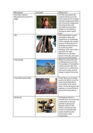 This document defines and describes various camera angles, camera movements, compositional techniques, and shot types used in filmmaking. High/low angles and bird's eye/worm's eye views are defined based on the camera's position relative to the subject. Camera movements like pans, tilts, tracks/dollies, cranes/steadicams, and zooms/reverse zooms are also outlined. Compositional techniques covered include deep/shallow focus, pull focus, rule of thirds, and eye line matching. Common shot types like long shots, close ups, medium shots, point of view shots, and two shots are also defined.