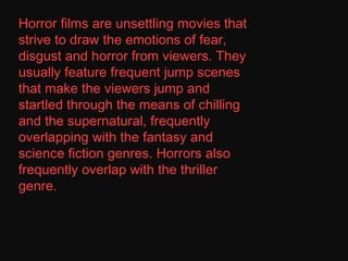 Horror films strive to elicit emotions of fear, disgust, and horror from viewers through frightening scenes and supernatural elements. They often overlap with fantasy and science fiction genres and thrillers. The first horror film was made in 1896 by George Milies called The House Of The Devil, though the genre has origins dating back to the beginning of movies. Early horror films included adaptations and expressionist works from Germany in the early 1900s that influenced decades of filmmakers.