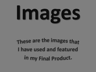 The document contains images used for a magazine front cover, contents page, and double page spread featuring Alice as the main subject. Additional photographs were taken of friends for a feature on a band, and an image of Ellie Goulding was taken at a gig organized by the author in March 2011 and used in the contents page.