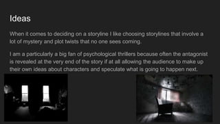 He provides inspiration from films like Shutter Island where the main character's actions are unknown and Fight Club where the protagonist lives two unbeknownst lives. Bailey is comfortable with the thriller genre having done past projects and understands typical conventions like close-ups, lighting, and tension-building techniques. He requests