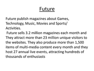 Future publishes magazines focused on games, technology, music, movies and sports/activities. They sell over 3 million magazines per month and attract over 23 million unique website visitors. Future also produces over 1,500 pieces of multimedia content per month and hosts 27 annual live events. They are the largest guitar magazine publisher worldwide and maintain leading music magazines such as Guitar World, Guitar Aficionado, Rhythm, and Classic Rock.